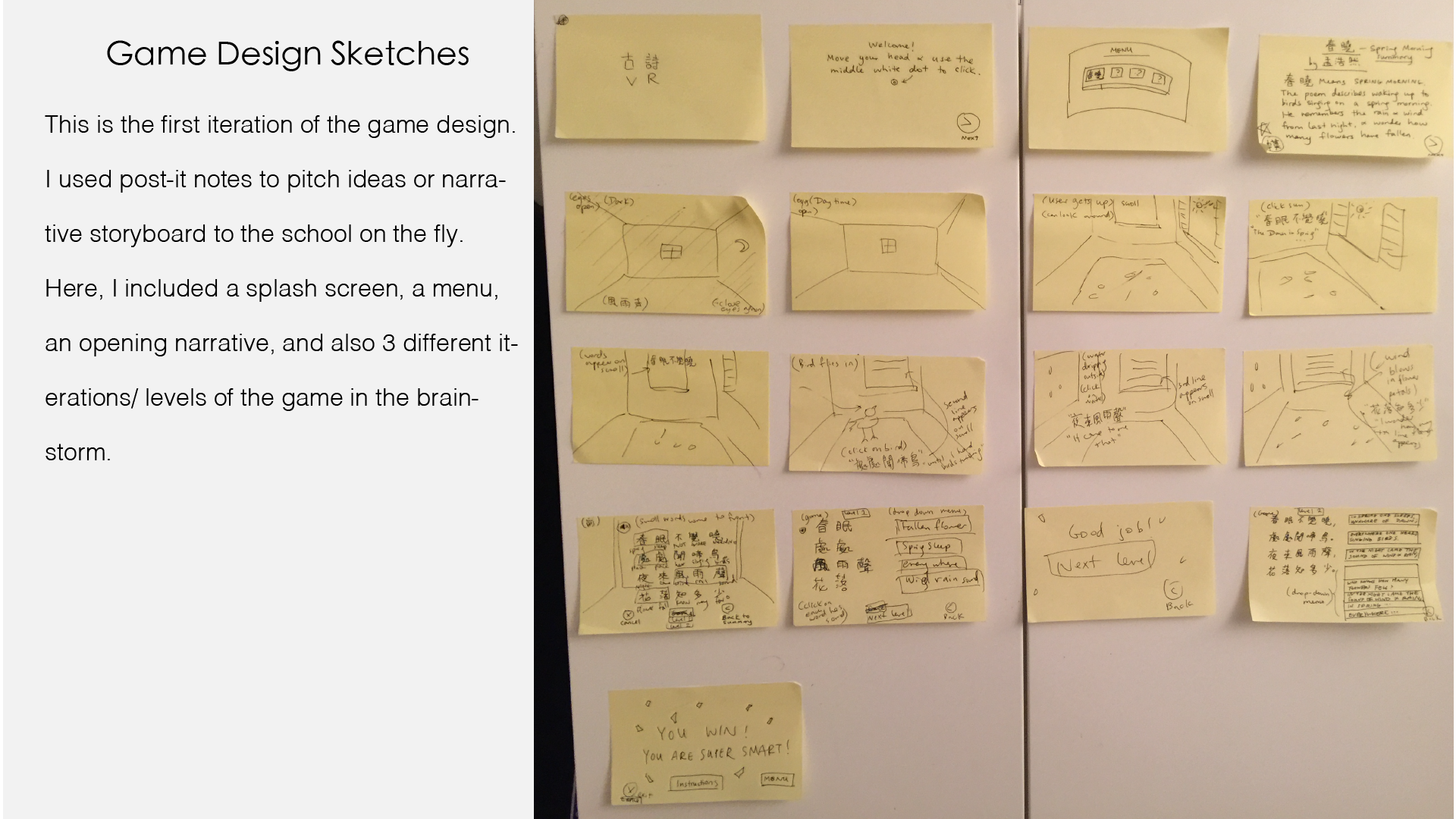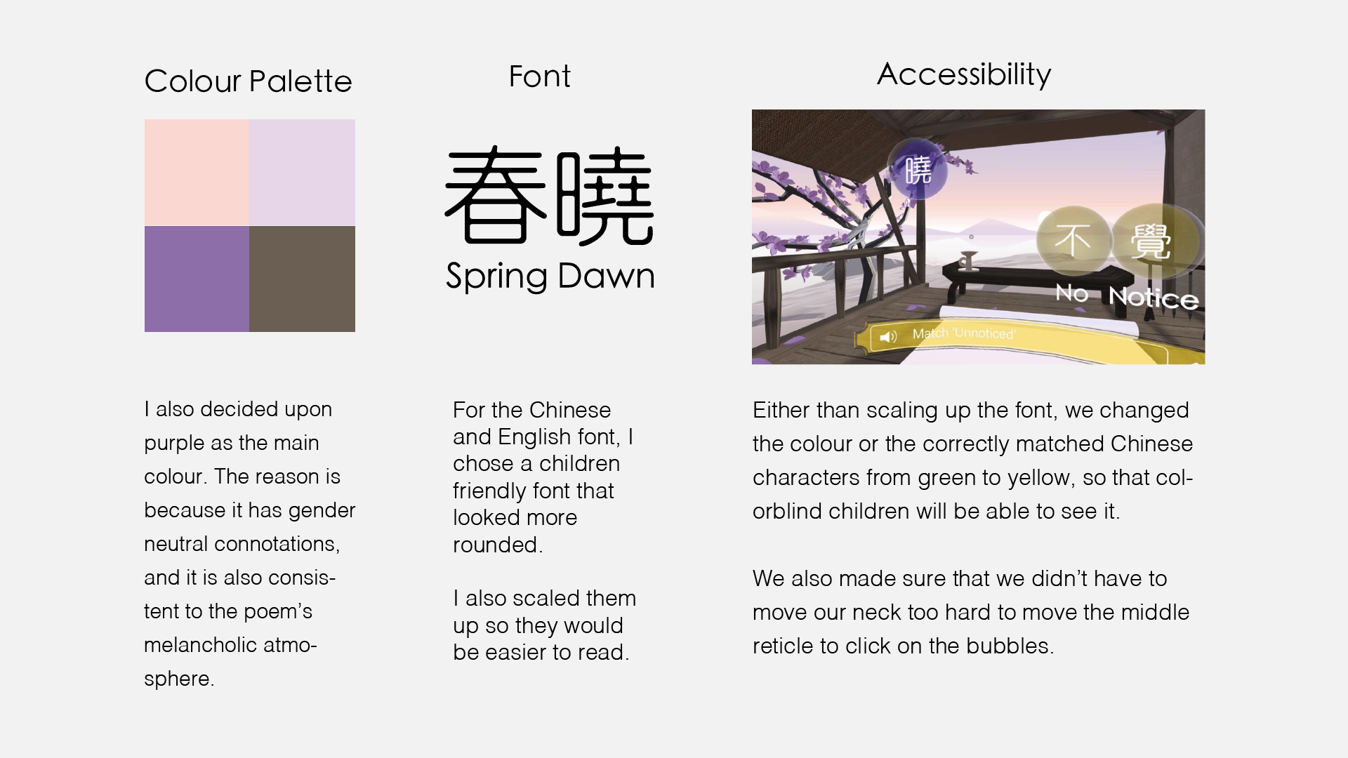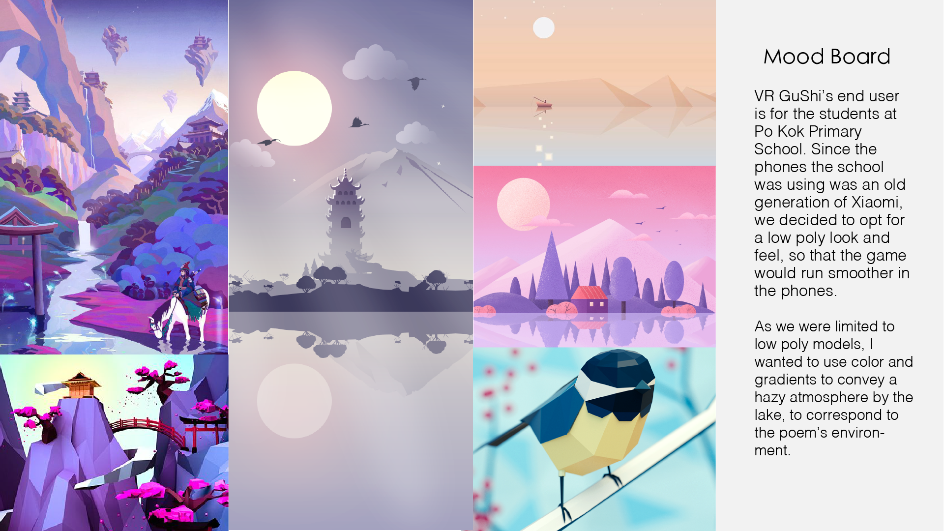 VR GuShi is a Google Cardboard educational prototype (*now upgraded to Meta Quest) to learn Chinese poetry, developed for buddhist school Po Kok Primary School in Hong Kong. The students are English speaking ethnic minorities in Hong Kong who are from nearby countries; such as Sri Lanka, Cambodia and the Philippines. Thus, this game is developed as an educational supplement, aiming to visually anchor the children’s impression of the Chinese characters, as well as comprehend the linguistic differences between English and Chinese.